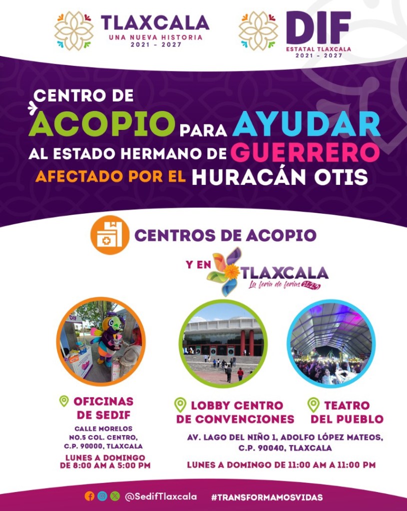 Cabe destacar que otro punto de acopio se encuentra habilitado en las oficinas del Sistema Estatal DIF, ubicadas en la calle José María Morelos, número 4, en la capital tlaxcalteca, en un horario de 8:00 a 17:00 horas.