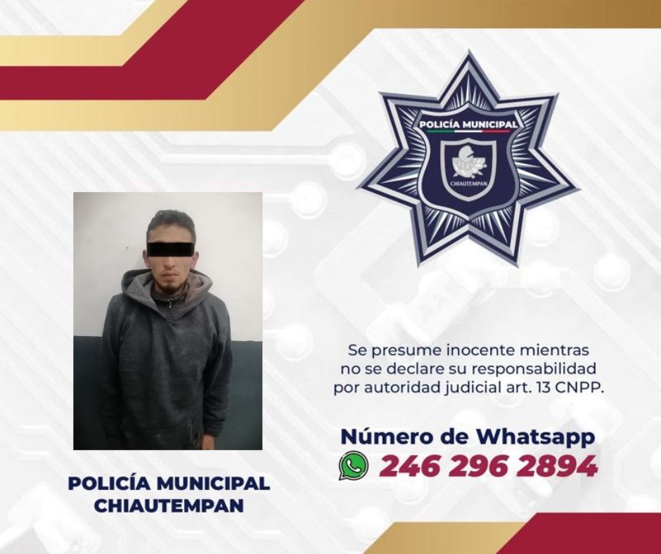 La Dirección de Seguridad Pública Municipal, Vialidad y Protección Civil de Chiautempan a través de elementos del Grupo de Operaciones Tácticas (GOT), detuvo a un masculino por robo a un negocio de telefonía móvil ubicado en la colonia Centro del municipio.