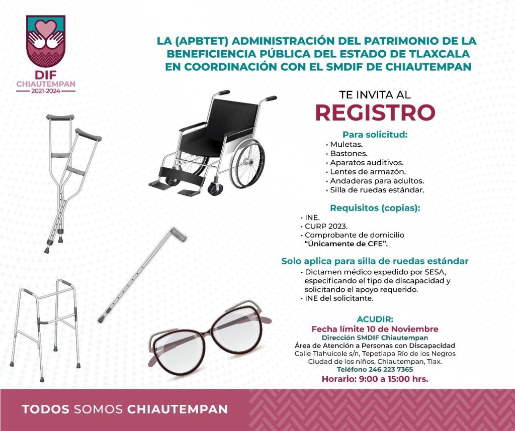 El Ayuntamiento de Chiautempan a través del Sistema Municipal para el Desarrollo Integral de la Familia (SMDIF), en coordinación con la Administración del Patrimonio de la Beneficencia Pública del Estado de Tlaxcala (APBPET) te invitan al registro para adquirir aparatos funcionales.