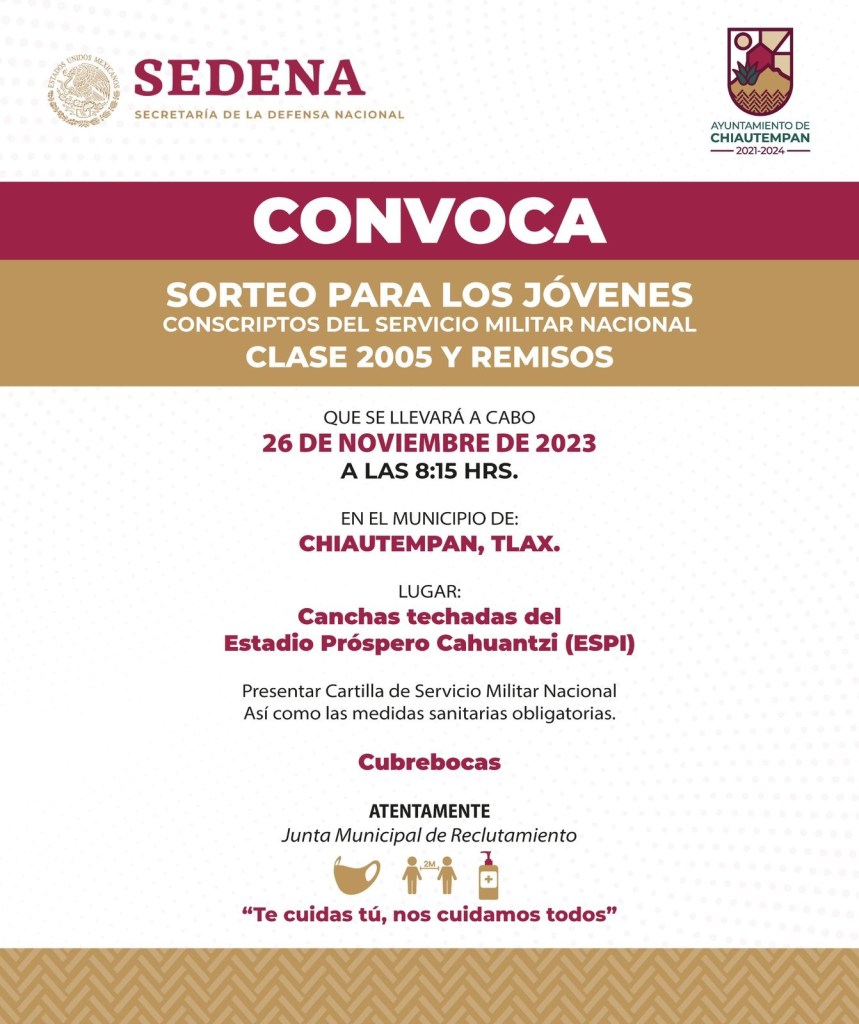 El Ayuntamiento de Chiautempan y la Secretaría de la Defensa Nacional (SEDENA) convocan al sorteo para los conscriptos del Servicio Militar Nacional (SMN), clase 2005 y remisos.