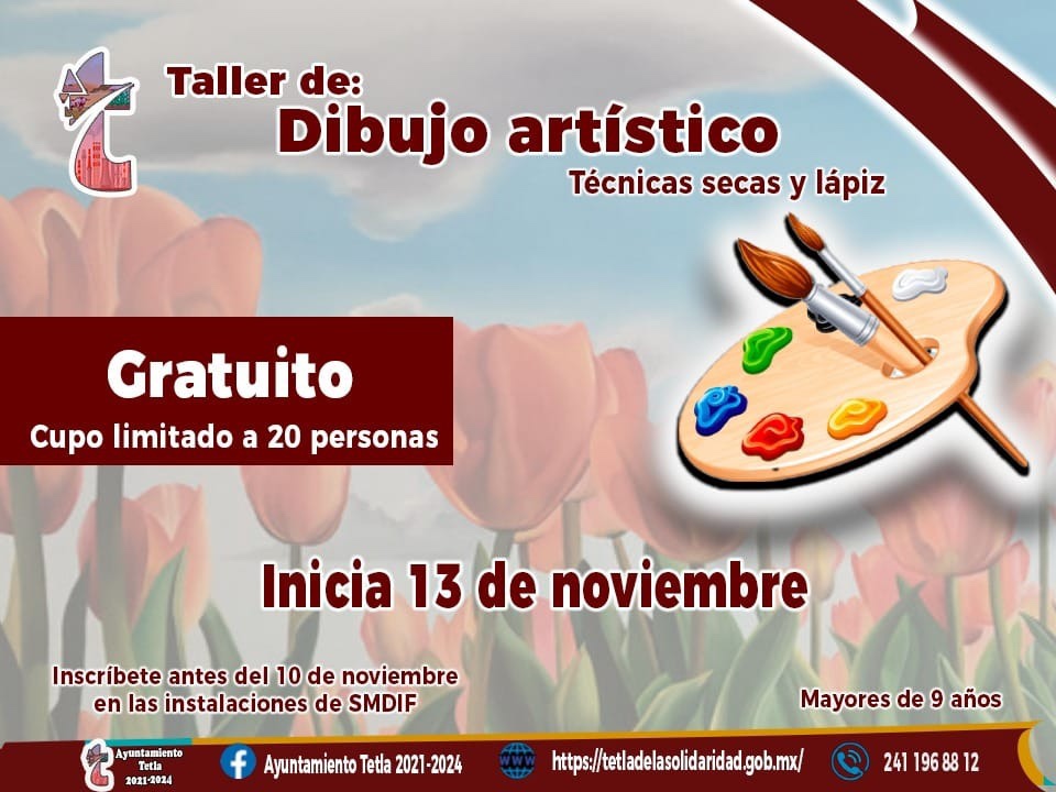 La presidenta del Sistema Municipal para el Desarrollo Integral de la Familia (SMDIF), Catalina Salomé Vargas Pérez, invita a la ciudadanía al taller de pintura, que inicia el día 13 de noviembre, este tendrá una duración de 3 meses