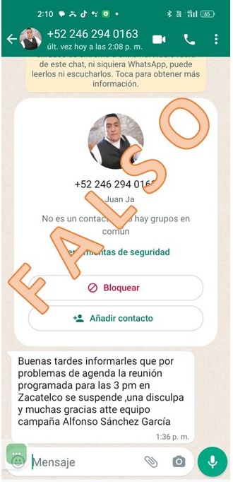 Este sábado, desde muy temprano, a través del número telefónico 246 294 0163, que aparentemente pertenece a Juan Ja, mandan mensajes a militantes de MORENA y ciudadanos que simpatizan con el proyecto de Sánchez García, para informarles que, por problemas de agenda se suspende la reunión programada para este día.