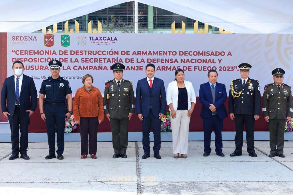 En representación de la titular del Ejecutivo local, Lorena Cuéllar Cisneros, el titular de la Secretaría de Gobierno (Segob), Luis Antonio Ramírez Hernández, encabezó la ceremonia de destrucción de armamento decomisado a disposición de la Secretaría de la Defensa Nacional (Sedena) y clausura de la campaña de canje de armas de fuego 2023.