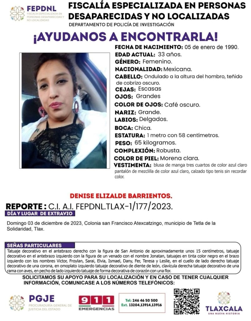 Si conoces su paradero o la haz visto, comunícate al número que aparece en el boletín de búsqueda. Comparte esto: Compartir en X (Se abre en una ventana nueva) X Comparte en Facebook (Se abre en una ventana nueva) Facebook Compartir en WhatsApp (Se abre en una ventana nueva) WhatsApp Imprimir (Se abre en una ventana nueva) Imprimir Compartir en Telegram (Se abre en una ventana nueva) Telegram Me gusta Cargando... Relacionado
