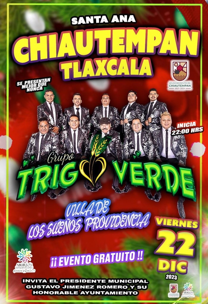El Ayuntamiento de Chiautempan invita al Gran Baile de Noche Buena con la presentación estelar del grupo “Trigo Verde” y “RMT, La Original Cumbia Romántica”, este viernes en el parque Juárez.