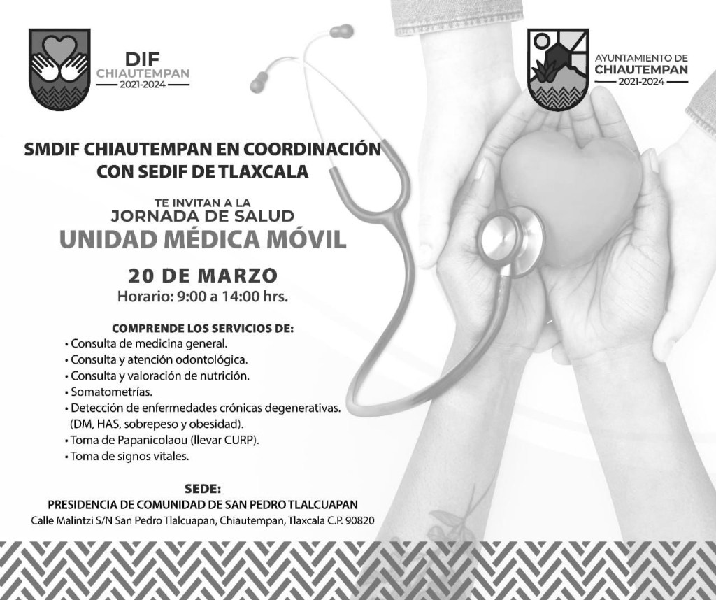 En esta ocasión la Unidad Médica Móvil visitará la Presidencia de San Pedro Tlalcuapan en Chiautempan para realizar la Jornada de Salud, el próximo 20 de marzo.