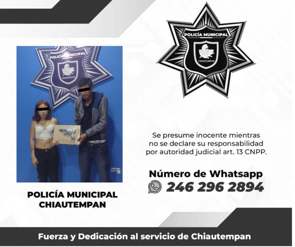Ambas personas fueron trasladadas a la Dirección de Seguridad Pública Municipal, Vialidad y Protección Civil de Chiautempan para los efectos legales correspondientes, cabe mencionar que la parte afectada descartó proceder legalmente, por lo cual, el hombre y la mujer, identificados como Iván N., y Jaqueline N., fueron puestos a disposición ante la Procuraduría General de Justicia del Estado (PGJE) para lo conducente por el presunto delito de cohecho y portación ilegal de arma de fuego.