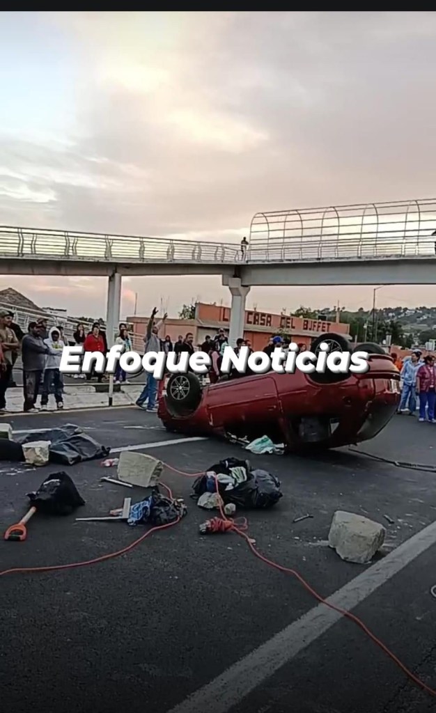 Pobladores bloquearon y volcaron un automóvil en la carretera Apizaco-San Martín a la altura de Tizatlán por presunto levantón a menor de 15 años.