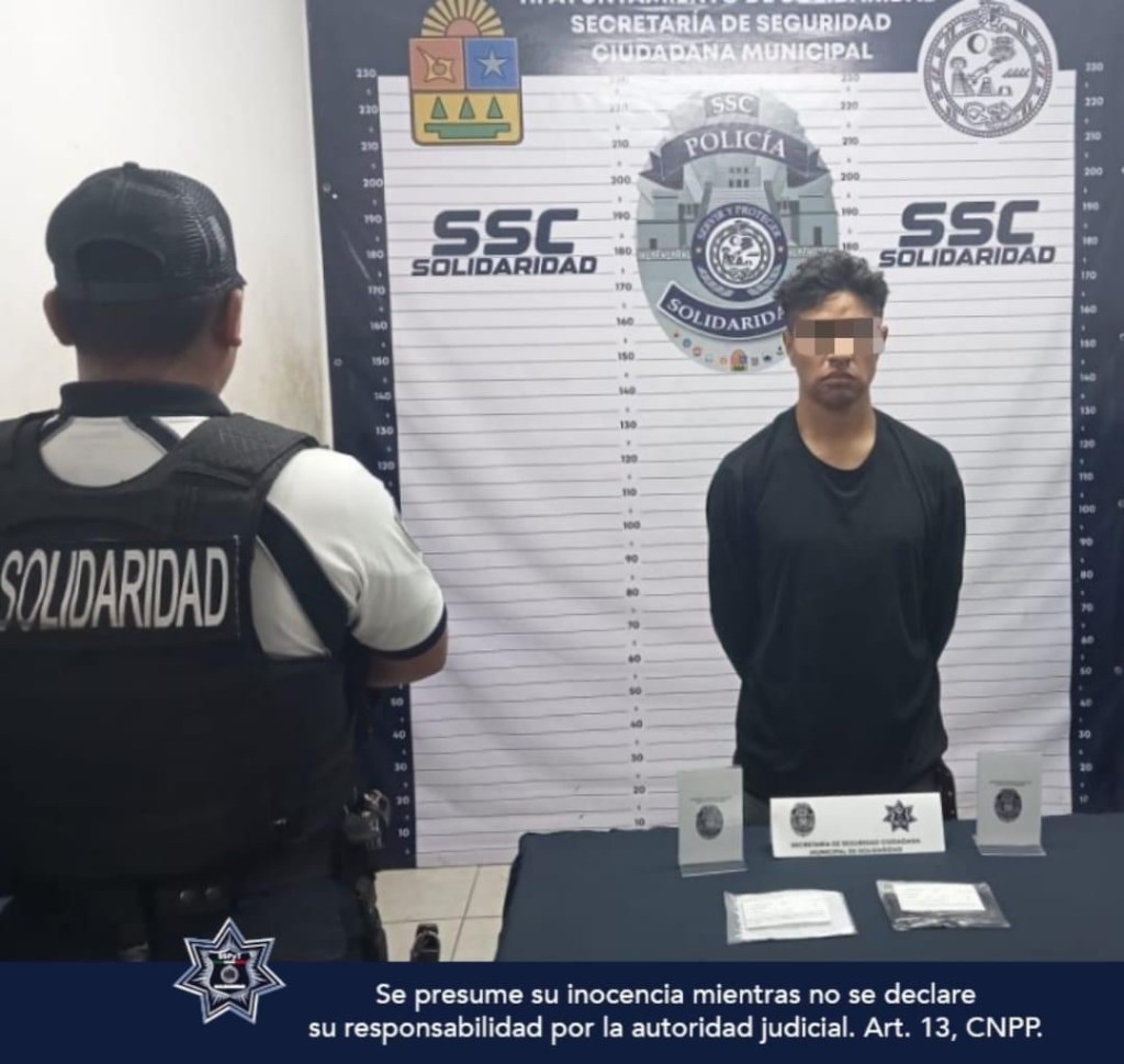 Cuando patrullaban sobre la Quinta Avenida Bis, los oficiales de la Policía Turística atendieron a un ciudadano que señaló a Emmanuel «N» de 29 años de edad, originario de Tlaxcala, como quien momentos antes ingresó al comercio donde labora y le exigió un pago bajo amenazas a modo de derecho de piso, por lo que de inmediato los policías le dieron alcance y tras una inspección le aseguraron una hoja de papel con una amenaza escrita, por lo que fue puesto a disposición de la Fiscalía General del Estado para las indagatorias correspondientes.