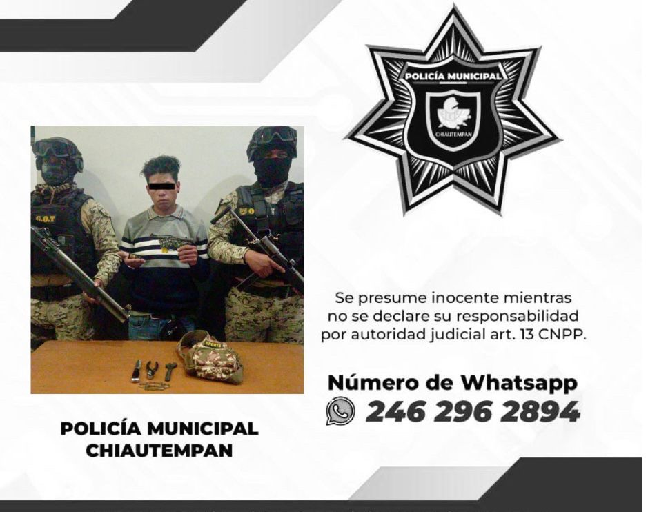 El Grupo de Operaciones Tácticas (GOT) de la Dirección de Seguridad Pública Municipal, Vialidad y Protección Civil de Chiautempan detuvo a un sujeto que transitaba con un arma de fuego, de la cual, no pudo acreditar su legal portación.