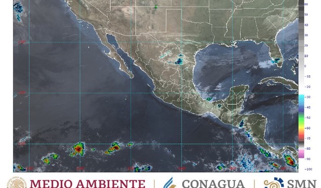 En contraste, continuará el ambiente de caluroso a muy caluroso con temperaturas máximas superiores a 45 grados Celsius en Guerrero y Michoacán; de 40 a 45 grados en Baja California, Campeche, Chiapas, Colima, Jalisco, Morelos, Nayarit, el sur de Oaxaca, Sinaloa, Sonora, Tabasco y Yucatán; de 35 a 40 grados en Baja California Sur, el occidente de Durango, el suroeste del Estado de México, el suroeste de Puebla, Quintana Roo y el sur de Veracruz, y de 30 a 35 grados en Aguascalientes, Chihuahua, Guanajuato y Zacatecas.
