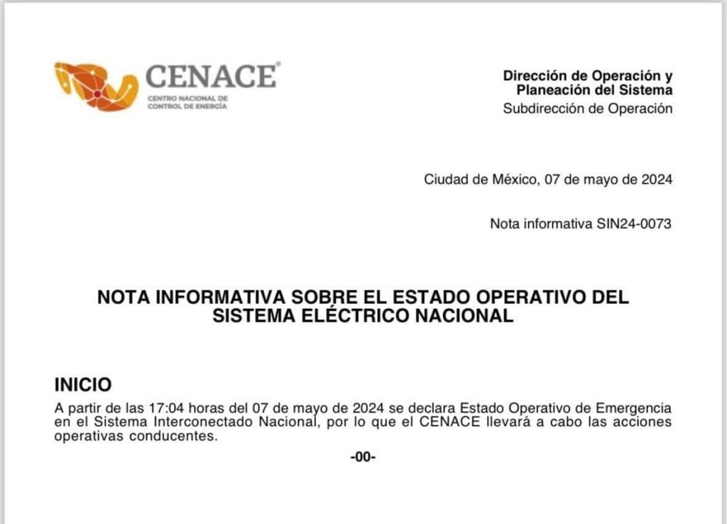 El Centro Nacional de Control de Energía decretó el estado de emergencia en el sistema eléctrico nacional. Gonzalo Monroy, director general de GMEC, dijo que esta emergencia se da por la ola de calor, debido a la alta demanda que existe en sistemas de refrigeración y ventilación