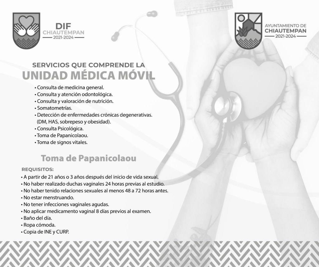 El Ayuntamiento de Chiautempan en coordinación con el el Sistema Municipal DIF invitan a la población en general a solicitar servicios médicos dentro de la jornada de salud.