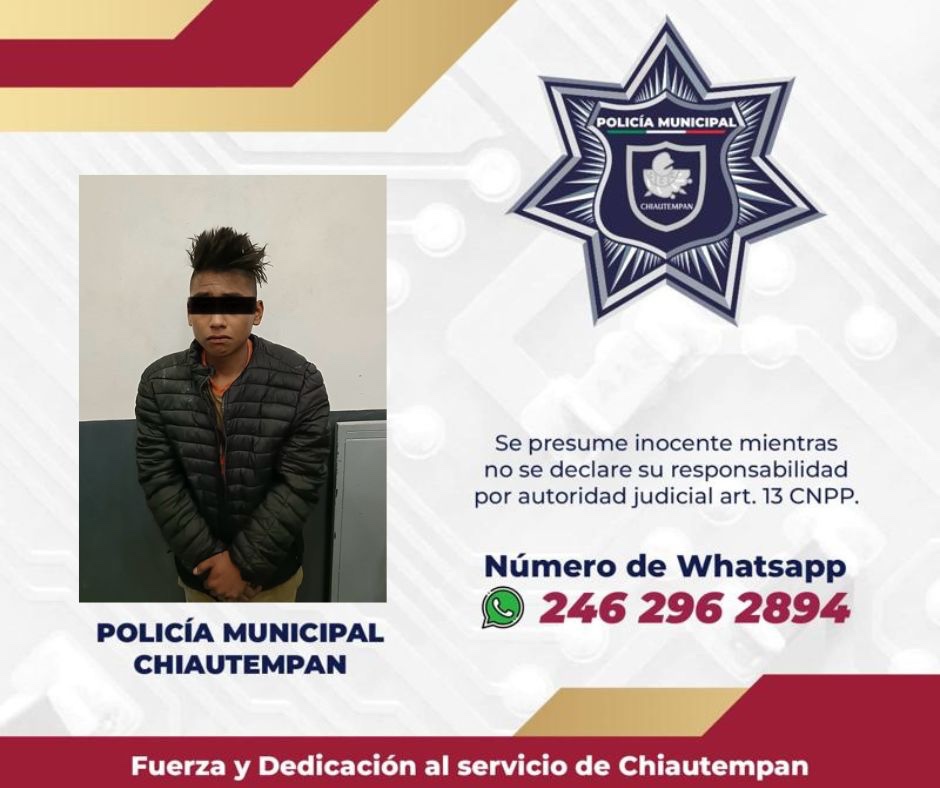 Elementos adscritos a la Dirección de Seguridad Pública Municipal, Vialidad y Protección Civil de Chiautempan, detuvieron a un sujeto por robo de pertenencias en agravio a dos menores de edad de identidad reservada.