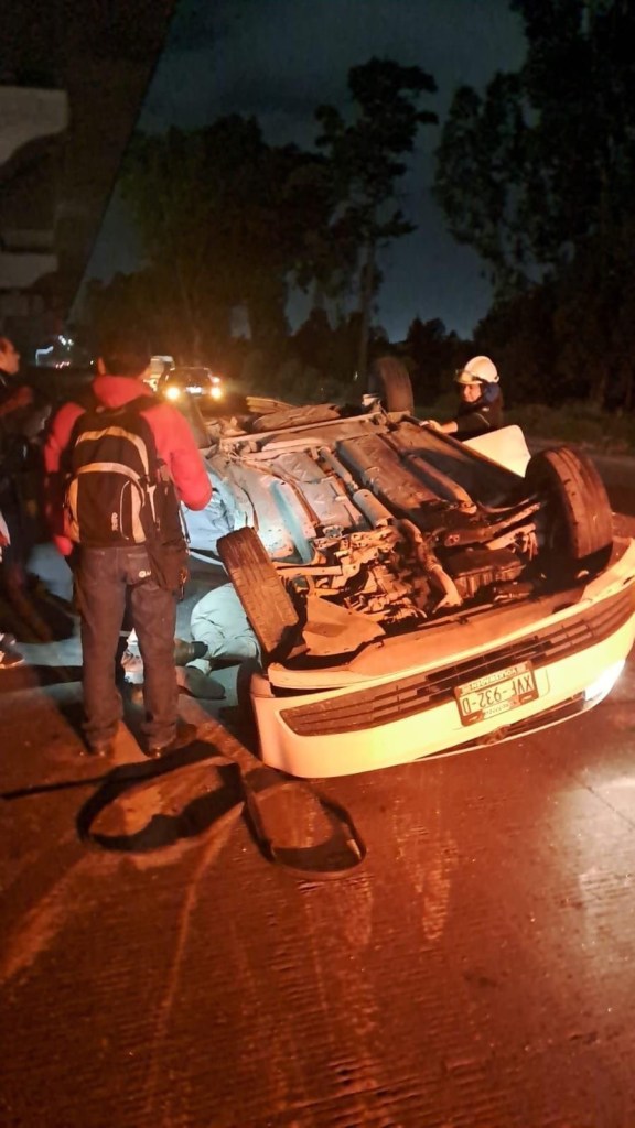 Aparentemente un tráiler tipo pipa los impactó y los hizo volcar, quedando el vehículo sobre su toldo, con las llantas hacia arriba.