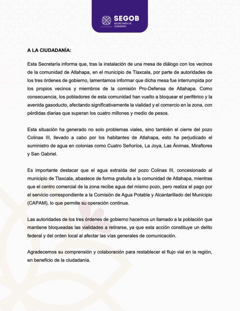 Las autoridades de los tres órdenes de gobierno hacemos un llamado a la población que mantiene bloqueadas las vialidades a retirarse, ya que esta acción constituye un delito federal y del orden local al afectar las vías generales de comunicación.