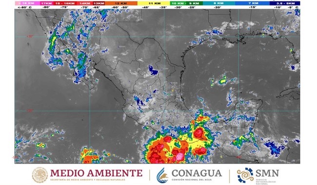 Se esperan lluvias puntuales intensas (de 75 a 150 milímetros [mm]) en Chiapas, Guerrero, Oaxaca, Puebla, Tabasco y Veracruz; muy fuertes (de 50 a 75 mm) en Chihuahua, Colima, Estado de México, Jalisco, Michoacán, Morelos, Nayarit y Sonora; fuertes (de 25 a 50 mm) en Ciudad de México, Durango, Guanajuato, Hidalgo, Querétaro, San Luis Potosí, Sinaloa y Tlaxcala; intervalos de chubascos (de 5 a 25 mm) en Aguascalientes, Campeche, Coahuila, Nuevo León, Quintana Roo, Tamaulipas, Yucatán y Zacatecas, y lluvias aisladas (de 0.1 a 5 mm) en Baja California y Baja California Sur.