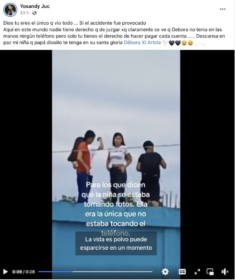 El Departamento de Bomberos de Alta Verapaz, Guatemala, informó que la joven murió al recibir una fuerte descarga eléctrica y trascendió en medios locales que había sido mientras que la quinceañera se tomaba algunas fotografías; sin embargo en el nuevo clip de 26 segundos se observa que ella era la única de sus amigos que no usaba su celular.