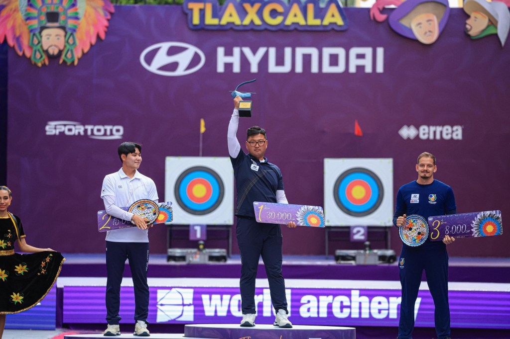 La gobernadora Lorena Cuéllar Cisneros y Gabriel Ramos, presidente de World Archery Mexico (Wamex), entregaron a Kim Woojin, de Corea del Sur, el trofeo de la Final de Copa del Mundo de Tiro con Arco Tlaxcala 2024 en la modalidad de arco recurvo varonil.