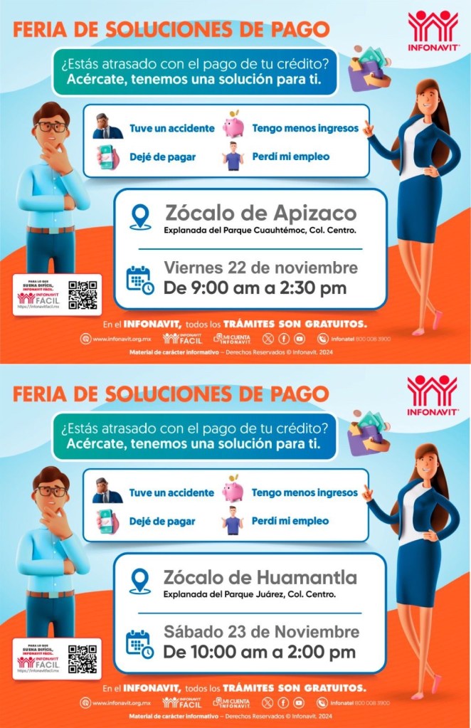 · El viernes 22 y sábado 23 de noviembre se realizarán Ferias de Soluciones de Pago en los municipios de Apizaco y Huamantla, para apoyar a las personas a regularizar sus créditos.