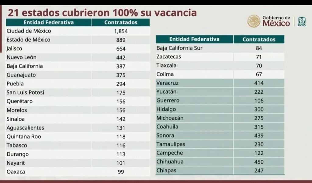 El director general del Instituto Mexicano del Seguro Social (IMSS), Zoé Robledo Aburto, informó que Tlaxcala, junto con 20 estados más, cubrieron al 100 por ciento la contratación de médicos especialistas en la “Feria de Reclutamiento IMSS 2025”, quienes iniciaron a laborar en instituciones médicas el 16 de marzo pasado.