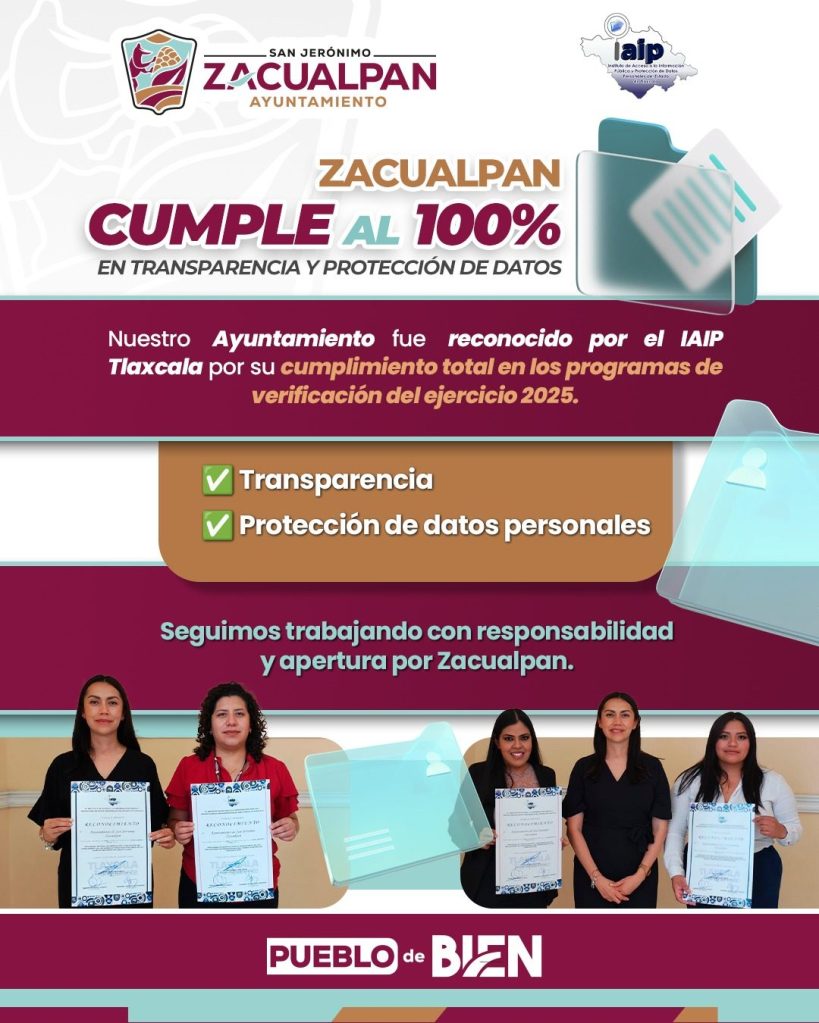 Con mucho orgullo les compartimos que el IAIP Tlaxcala reconoció la labor de nuestro ayuntamiento en estos temas fundamentales. Gracias al trabajo responsable y dedicado de todo el equipo, obtuvimos una calificación perfecta: 100 puntos porcentuales, lo que nos coloca con cumplimiento total en materia de transparencia.